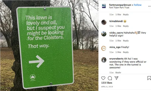 Fort Tryon is a complex and special place — it offers jaw-dropping views of the Hudson, winding pathways that let you forget you’re in the city, and the last vestiges of the historic Billings estate, not to mention the Cloisters. In an effort to give more personality to the park (spoiler alert: it’s sassy and bilingual) and add surprise and delight to the visitor experience, public engagement coordinator Jennifer Graeff and I worked with the park administrator and local parkgoers to better understand Fort Tryon — how it’s used, what corners of it are often overlooked, and what secrets it might share, given the chance. We then drafted, produced, and installed signs throughout the park that invited parkgoers to see this space with fresh eyes and engage with it in a new way.